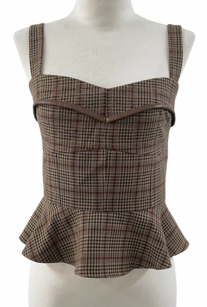 Slip into this sleeveless peplum top and be the envy of every trendsetter. The antique gold hardware and leather trim piping add a touch of timeless sophistication, while the back zipper ensures a flawless fit. Get ready to turn heads with this fitted top.