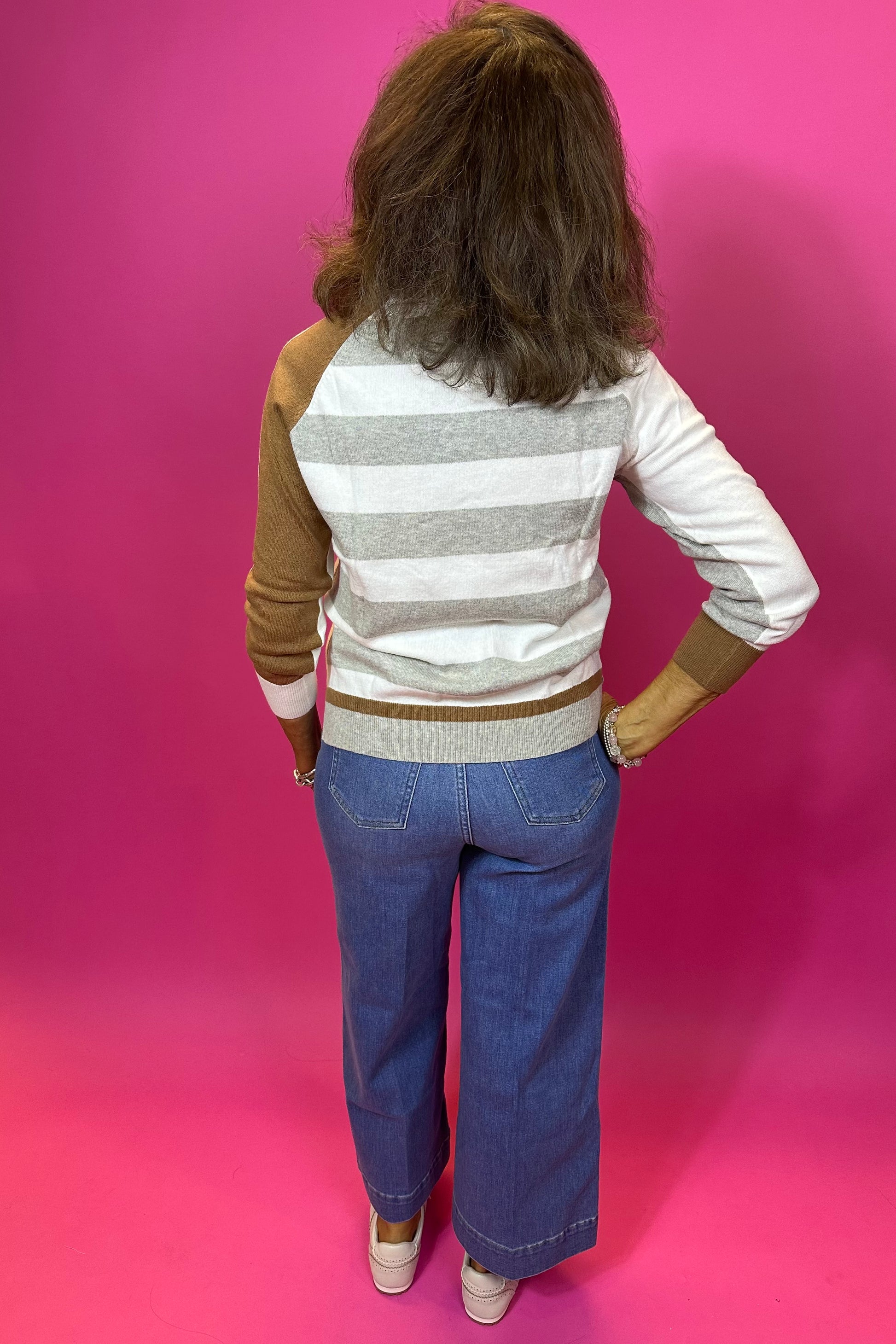 Lightweight sweater with grey and white and camel stripes on the back