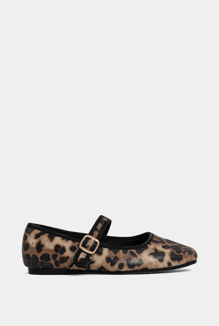 A wild twist on a timeless classic. The ADELINE MINI in Leopard Print brings playful charm to the Mary Jane silhouette with a bold faux animal texture and a sleek gold-tone buckle. Designed for comfort and easy wear, this mini flat pairs perfectly with dresses, leggings, or whatever her little heart desires. Let her step into style-fierce, fun, and totally fabulous.