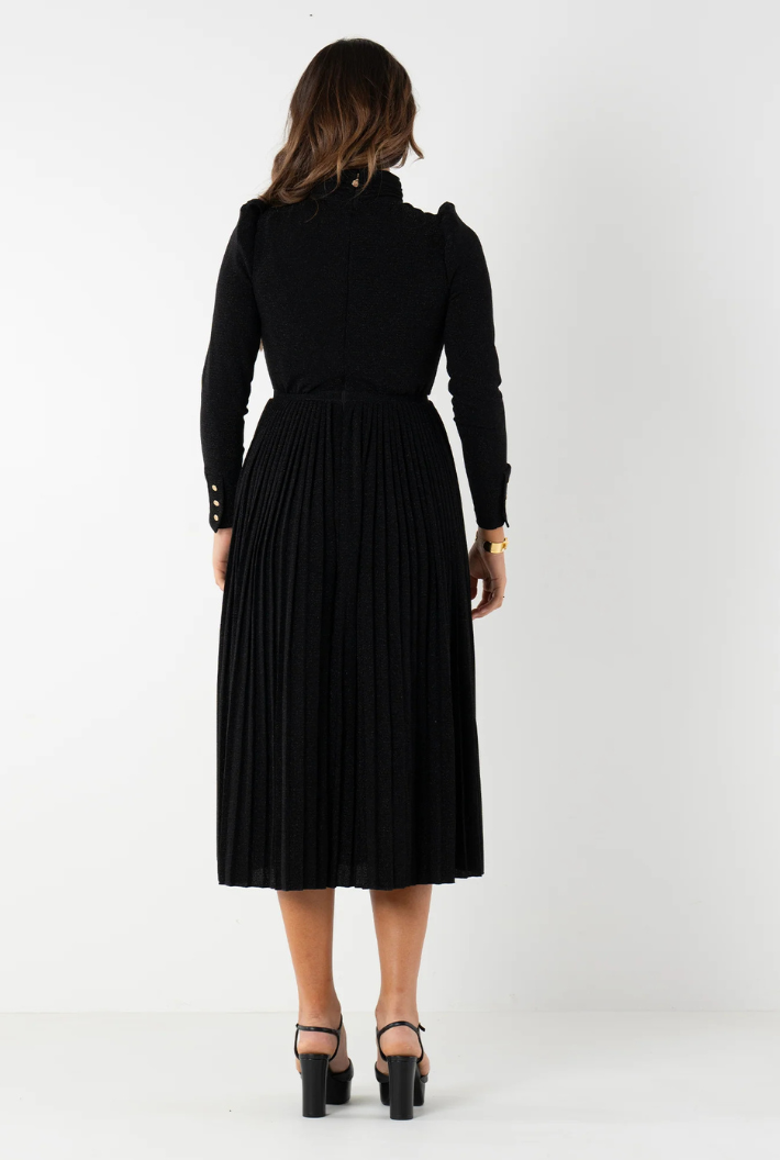 The Tessa Dress in Tap Shoe features a pleated mock neck and fitted bodice, flowing into a graceful pleated midi-length skirt. A hidden back zipper with a signature gold logo pull ensures a seamless finish. Crafted in a subtly shimmering fabric, this design is the ultimate party dress—made for moving, mingling, and dancing the night away in style.